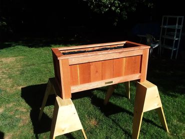 The above planter box is one of our100% cedar raised planter boxes. Note the deeper box design great for planters with more robust root structure.